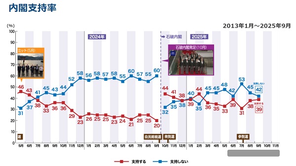 この時の世論の関心は、物価高への対応のほか、裏金議員の追及と再発防止が最大の課題だったが、石破内閣は、政治と金の課題に積極的には取り組めなかった。抵抗が余りに大きかったのだろう。企業献金は廃止できないなどと言い続けた結果、政治と金を巡る問題は尾を引いた。その結果の参議院選挙だ。安倍派は、統一教会との癒着、裏金問題など自民党の評判を下げる最大要因だった。総裁になってからの石破氏は、安倍晋三氏の盟友である麻生派からの協力を得られず、自分の望む施策が殆どできなかった。その考え方は参議院選挙後の広島、長崎での挨拶、8月15日の式典での首相の言葉などににじみ出ている。真意が少しずつ理解されてきたのか、選挙後のNHK世論調査で石破内閣支持率は上昇し、最後は39%になっている。自民党支持者では支持率が過半を超える。私は首相を続けて欲しいと願っていたので、辞任はとても残念だった。