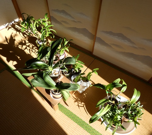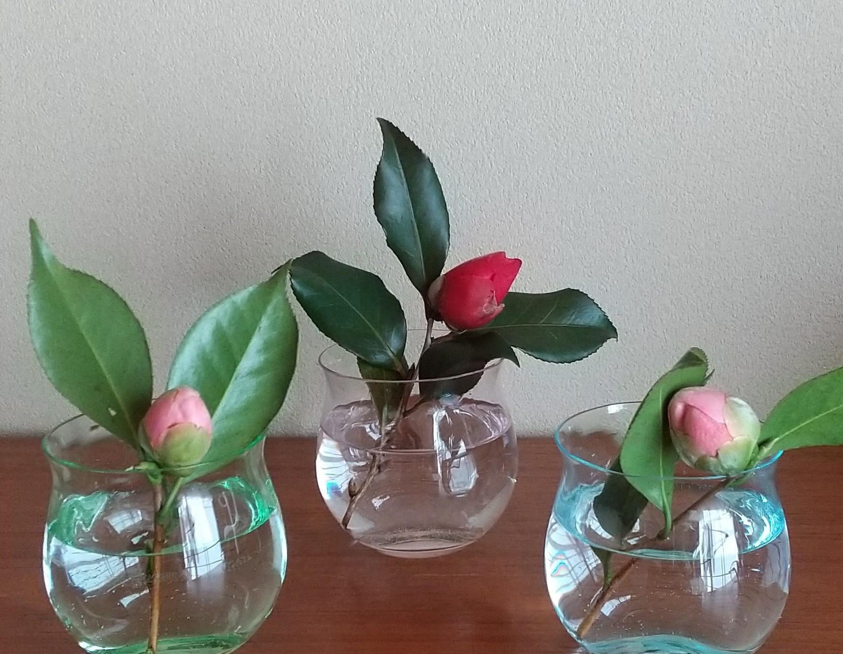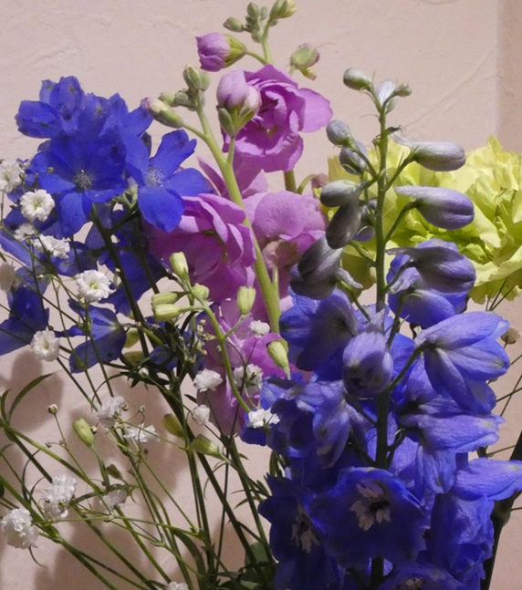 1月31日に親しい人から贈られた花束(青はデルフィニウム、ピンクはストック(ニオイアラセイトウ)、黄はカーネーション、白はカスミソウ)、2月1日午後6畳の奥まで差し込む西日。同日夜の満月(月齢カレンダー)。2日にNさんから送られたツバキ(ピンク色の品種は西王母)。