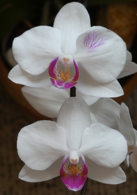 下の写真は、コチョウランの一つの花茎からでた2つの花だ。上の花は、右側花弁の一部に紫の縞が出ている。20程ついている花の中でこのような縞がでているのは、この一輪だけだった。最初は「あれっ!」という驚きだった。次には、「なんだろう」、「どうしてこんなことが起きるのか」という疑問が起きた。考えてみても分からない。変異は実際にあるのだから、何かそうなる理由はあるとは思うが、考えはそれより先には進まない。このような変異は、コチョウランの生存には何も悪影響はない。商品として売る場合には、見栄えが悪いと言って売れにくくなることはあるかもしれないが、変異の出方によっては、逆に面白がって買ってくれる人がいるかもしれない。